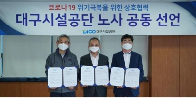 지역 내 코로나19가 급속도로 확산되던 지난 3월, 대구시설공단과 양 노조는 ‘코로나19 위기극복을 위한 노사공동선문’을 발표하고 감염증 확산 방지와 지역사회 경제위기 극복을 위해 전 방위적 지원 사업을 펼치고 있다.