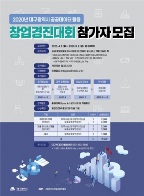 [충청뉴스큐]대구시와 대구디지털산업진흥원은 공공데이터를 활용한 창의적인 아이디어와 비즈니스모델을 발굴하기 위해 ‘2020년 대구광역시 공공데이터 활용 창업경진대회’ 참가자를 오는 5월 8일까지 모집한다.