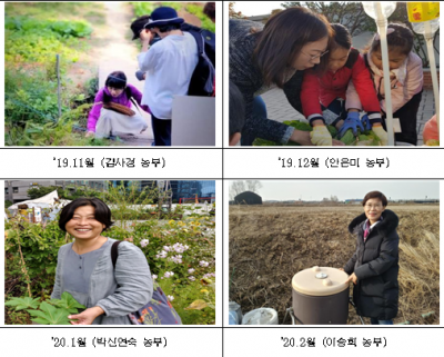 · ‘19.11월 김사경 농부, ’19.12월 안은미 농부, ‘20.1월 박신연숙 농부, ‘20.2월 이승희 농부, ‘20.3월 혜윰뜰 도시농업공동체 도시농업을 즐기고 관심을 가지는 연령과 거주지도 다양해지고 있다.