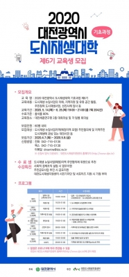 [충청뉴스큐] 대전시 도시재생지원센터는 다음달 8일까지 ‘2020 대전광역시 도시재생대학 기초과정’수강생을 모집한다고 10일 밝혔다.