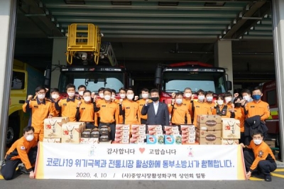 [충청뉴스큐] 대전동부소방서는 10일 코로나19로 어려움을 겪고 있는 전통시장 상인들에게 도움을 주기 위해 중앙시장에서 물품 공동구매 행사를 가졌다.