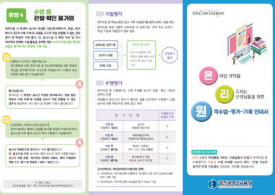 이번 리플릿 자료는 교육과정 성취기준과 교과서 내용, 그리고 학생들의 수준을 고려해 원격수업을 설계해 운영하고 지필평가를 통해 성취도 등을 확인한다는 내용과 함께 수행평가로 반영 가능한 경우와 불가한 경우를 과목별 사례와 함께 제시하고 있어서 온라인 개학 이후 평가와 관련된 교사와 학생들의 의문점을 해결해 줄 것으로 기대하고 있다.