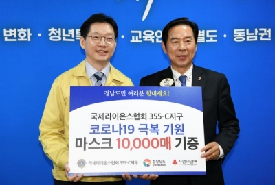 [충청뉴스큐] 창원에 소재한 국제라이온스협회 355-C지구가 코로나19 극복을 위한 마스크 1만 개를 경상남도에 14일 기증했다.