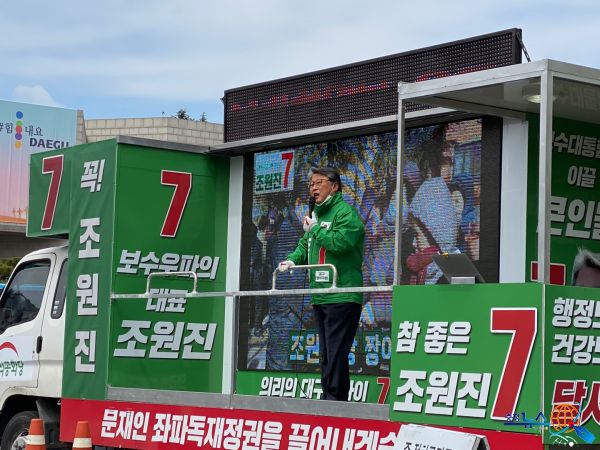우리공화당 조원진 후보(대구 달서구병)는 선거운동 마지막 날인 14일 07시 본리네거리 아침 인사를 시작으로 달서구병 구석 구석 릴레이 유세를 통해 막판 표심잡기에 최선을 다했다. 조 후보는 “코로나19로 어려운 상황에서 대구시민과 달서구민께서 보여주신 헌신과 노력은 대구가 얼마나 위대한 지를 보여주셨다”면서 “대구의 정신을 살리고 자유대한민국을 목숨 걸고 지킬 조원진을 꼭 선택해달라”고 호소했다. 이어 조 후보는 “조원진은 대구시민과 달서구민께서 지금껏 키워주셨고 한결같은 믿음과 성원으로 당당하게 박근혜 대통령 무죄석방과 문재인 정권 심판을 위해 싸울 수 있었다”면서 “무능하고 독선적인 문재인 좌파정권을 끝장낼 수 있도록 대구의 자존심 조원진을 꼭 지켜달라”고 호소했다. 미래통합당과의 보수대통합과 관련해서 조 후보는 “우리공화당은 박근혜 대통령님의 뜻에 따라 미래통합당과 통합을 하기 위해 노력했고 당선이 되면 미래통합당과 합쳐서 반드시 정권교체를 이루겠다”고 말했다. 조 후보는 “12년간 달서구민께 드린 대구시 신청사 유치 약속을 지켰고 달서구의 발전을 위해 구 내당시장 지식산업센터 유치, 달서영어도서관 개관, 달서시장 시설현대화 등 많은 노력을 했다”면서 “달서구민의 성원으로 4선이 되면 더 큰 달서구, 희망의 달서구를 위해 최선을 다하겠다”고 지지를 호소했다.