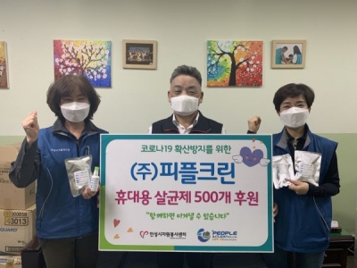 ㈜피플크린 장문희 대표는 “지역사회가 어려운 때 일수록 힘을 합쳐서 위기를 극복해야한다고 생각한다 그래서 우리 업체에서 할 수 있는 방역소독활동으로 안전한 지역사회를 만들고 코로나19를 극복하는데 보탬이 되기를 바라는 마음으로 휴대용 살균제를 후원을 하게 됐다 앞으로도 직원들과 방역소독활동을 펼치며 위기를 함께 극복해 나가도록 노력하겠다”고 말했다.