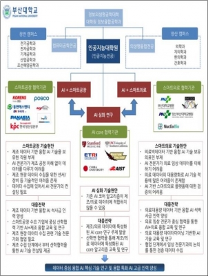 아울러 산학 협력 공동연구를 위해 부산대학교를 중심으로 코렌스, 파나시아, KTE, 동연에스엔티, 마이텍 등 18개 기업이 참여해 제조분야 인공지능 기술 개발 및 고도화를 추진하고 뉴클리스바이오, 비비비, 휴이노, 딥노이드 등 12개 기업이 부산대병원과 연계해 의료 빅데이터 활용 플랫폼 구축과 스마트 의료 인공지능 기술개발을 위한 산학협력 연구체계를 구축하게 된다.