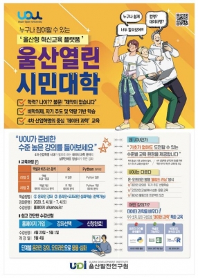 울산시와 울산발전연구원은 비학위 과정의 역량 위주 혁신 교육 플랫폼을 통해 4차 산업혁명 시대에 지역에서 필요한 실무 인재를 양성하기 위한 ‘울산열린시민대학’을 올해 5월부터 확대 운영한다고 밝혔다.