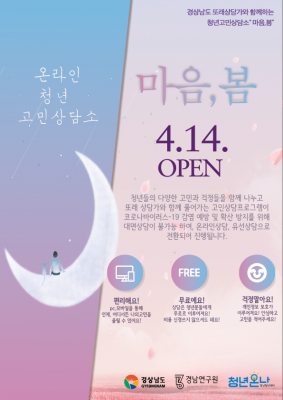 코로나19에 따른 ‘사회적 거리두기’로 비대면 심리 상담을 위해 경남도 청년센터 청년온나 홈페이지에 ‘청춘와락’ 게시판을 개설했으며 여기에서는 ‘2019년 경상남도 또래상담사 양성 과정’을 이수한 청년들로 구성된 청년 또래상담사와 전문심리상담사를 활용해 온라인 및 유선방식으로 상담을 진행할 예정이다.