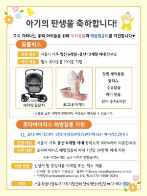 ‘로타바이러스 예방접종비’는 서울시 거주 출산 6개월 이내 기준 중위소득 100%이하 미혼한부모 가정을 대상으로 자녀 1인당 최대 24만원씩 지원된다.