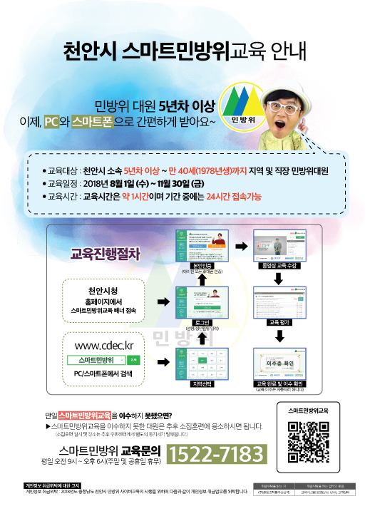 민방위 스마트 교육은 천안시 소속 민방위 대원 5년차 이상이면 누구나 1시간 동안 PC와 스마트폰을 이용해 교육을 받을 수 있다.