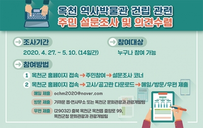 옥천군은 역사박물관 건립 추진과 관련해 주민의견 수렴을 위한 현대적 순문제도인 설문조사를 오는 4월 27일부터 5월 10일까지 2주간 실시한다.