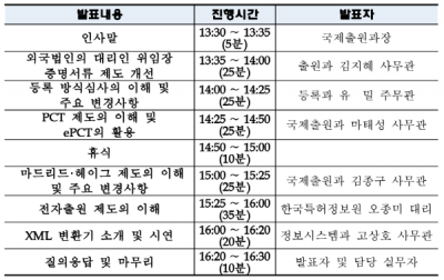 주요 내용으로는 ,외국법인의 대리인 위임장 증명서류 제도 개선 ,등록 방심심사의 이해 및 주요 변경사항 ,특허협력조약 국제출원 PCT 국제출원 : 하나의 특허 출원서로 PCT 조약에 가입한 복수의 국가에 출원한 효과를 부여하는 제도의 이해 및 ePCT ePCT : PCT 업무를 전자적으로 처리하기 위해 도입된 세계지식재산기구의 웹 포탈