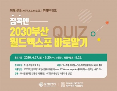 [충청뉴스큐] 부산시는 2030년 미래의 주역인 청소년이 엑스포를 이해하고 관심을 가질 수 있도록 2030부산월드엑스포 범시민유치위원회와 공동으로 ‘집콕엔 2030부산월드엑스포 바로알기 퀴즈’ 온라인 이벤트를 개최한다고 밝혔다.