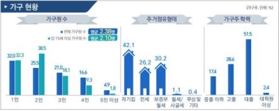 1인 가구의 비율이 가장 높고 2인 가구, 3인 가구 순이었다.