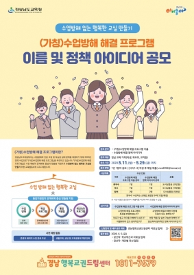 [충청뉴스큐] 경상남도교육청은 학교 현장 교원의 가장 큰 바람 중의 하나인 ‘수업방해 없는 행복한 교실’을 만들기 위해 2020년 정책 과제로 추진 중인‘수업방해 해결 프로그램’의 현장 정책 아이디어를 공모한다.