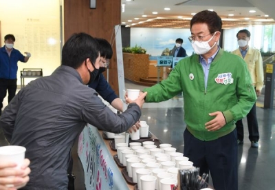 격려인사로 출근 직원을 맞이한 이철우 지사는 “청내 방송을 통해 흘러나오는 노랫소리나 모닝커피 한잔이 대단한 건 아니지만, 1%의 작은 배려와 관심이 직원들의 기분을 100% 업시켜, 코로나19로 힘든 지역사회에 새로운 활기를 불어넣을 창의적인 정책을 발굴하는 에너지로 작용하기를 바란다’고 말했다.