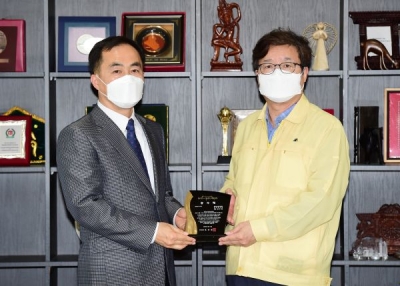 염태영 시장은 11일 선거연수원을 찾아 이선주 선거연수원장에게 감사패를 전달했다.