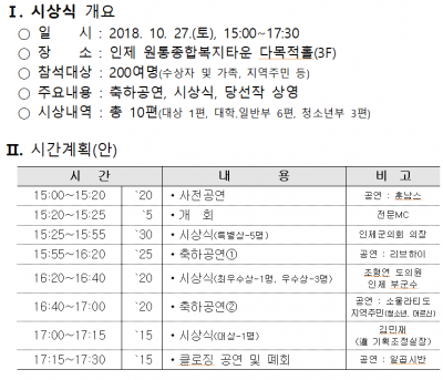 시상식에서는 당선작 상영, 리브하이, 소울라티도 등 초청가수와 지역 주민 축하공연, 경품 증정 등 다양한 이벤트가 진행될 예정이다.