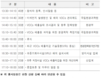 이번 세미나에서는 저장시설 등의 VOCs 관리 정책방향, VOCs 배출원 추적을 위한 측정기법, 최근 VOCs 배출저감 기술동향 및 사례 등을 소개하고 이들을 현장에 효과적으로 적용하기 위한 방안 등을 토론한다.