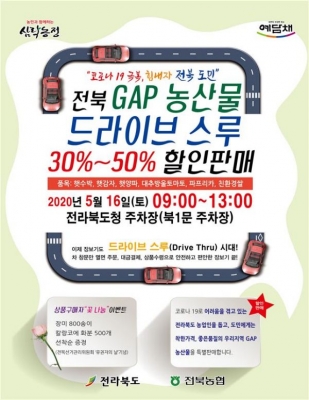 [충청뉴스큐] 전라북도와 전북농협은 생활 속 거리두기와 농촌과 도시의 나눔을 실천하는 착한소비로 도민들의 큰 호응을 받고 있는 ‘드라이브 스루’ 판매행사를 안전·안심의 GAP농산물 중심으로 오는 5월 16일 개최한다고 밝혔다.