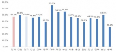 부산은 55.4%, 대전은 54.5%이었으며 경기도는 47.6%로 평균 수준이다.