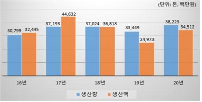 최근 5년 동안 생산량은 ’17년도 37,193톤으로 최고치였으나 금년에 1,030톤이 증가한 38,223톤을 기록해 최고기록을 경신했으며 생산액은 ’17년도 최고 446억원, ’19년도 최저 249억원을 기록했고 ’20년도에 345억원으로 회복세를 보였다.