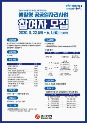 근로시간, 근로장소, 임금, 선발방법, 참여자 선발 발표 등 기타 자세한 내용은 22일부터 광주시와 5개 구청 홈페이지 등에서 확인할 수 있으며 광주시 시민공공일자리지원센터와 자치구 일자리부서로 문의하면 된다.