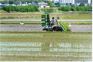 농부들이 이앙기를 이용해 넓은 면적을 빠른 시간 내에 가능한 기계 모내기를 하고 있다.