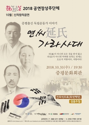 [충청뉴스큐] 예술공장 두레는 오는 31일 문화회관에서 2회에 걸쳐 증평지역의 독립운동가 연병호, 연병환, 연미당의 이야기를 담은 창작공연 "연씨 가라사대"를 선보인다.