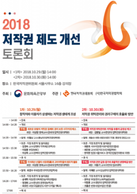 [충청뉴스큐] 문화체육관광부는 한국저작권위원회, 한국저작권법학회와 함께 29일과 오는 30일 오후 2시에 ‘2018 저작권 제도 개선 연속 토론회’를 위원회 서울사무소에서 개최한다.