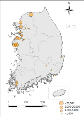 지역적으로는 지난해 10월과 비슷하게 경기, 강원, 충남 등 한반도 중부지방에 집중적으로 겨울철새가 도래했다. 월동 초기에는 중부지방에 겨울철새가 더 많이 도래하는 양상을 보인 것이다.