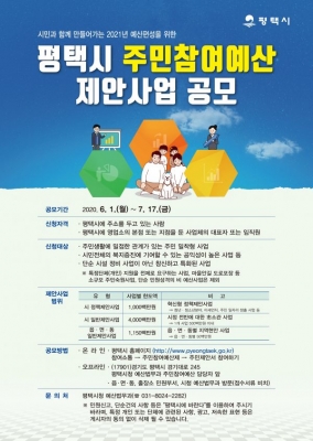 [충청뉴스큐] 평택시가 오는 6월 1일부터 7월 17일까지 2021년 예산편성을 위한 2020년도 주민참여예산 주민제안사업 공모 접수를 진행한다.