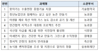 발표 과제는 지난 8월 30일부터 9월 13일까지 농촌진흥청과 4개 소속기관에서 제출한 28개 중 내부와 외부 전문가 심사를 거쳐 8개를 선정했다.