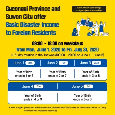 지원 대상은 5월 4일 24시 이전 경기도 내에 체류지 등록이 돼 있고 신청일 현재 수원시에 체류지 등록이 돼 있는 결혼이민자와 영주권자다.