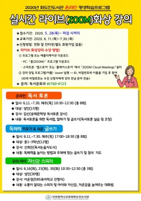 [충청뉴스큐] 인천시교육청화도진도서관에서는 지역주민의 자기 계발을 위한 학습활동 지원을 위해 실시간 온라인 화상 강의를 오는 11일부터 운영한다고 밝혔다.