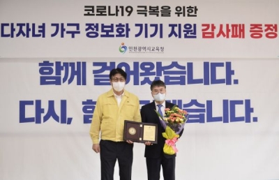 [충청뉴스큐] 인천광역시교육청은 1일 취약계층 다자녀 가구 24세대에 교육용 PC를 보급한 홍인성 인천 중구청장에게 감사패를 증정했다.