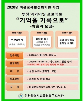 [충청뉴스큐] 인천시교육청북구도서관은 마을교육공동체사업의 일환으로 6월부터 ‘부평 아카이빙 프로젝트, 기억을 기록으로’를 운영한다.