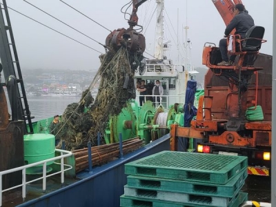 이번 시범사업은 트롤 선박을 이용해 장기간 해저에 침적된 통발, 로프류, 어망, 문어단지 등 폐그물 80톤을 수거했다.