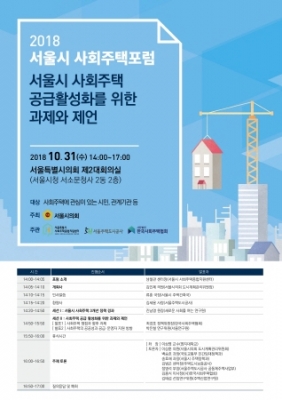 오는 31일 오후2시 서울시의회에서"서울시 사회주택 공급 활성화를 위한 과제와 제언"을 주제로 열리는 이번 포럼은 서울시의회가 주최하고, 서울주택도시공사와 한국주택종합지원센터, 한국사회주택협회가 주관한다.