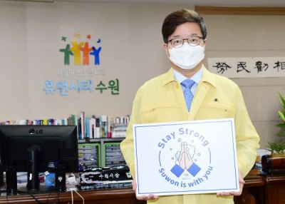 염태영 시장은 ‘Stay Strong, Suwon is with you’라는 문구가 적힌 손 팻말을 들고 캠페인에 참여했다.