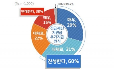 ‘긴급재난지원금’을 전 국민에게 1인당 20만원씩 추가 지급하는 방안에 대해서는 60%가 ‘찬성’ 입장을 나타냈다.
