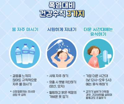 온열질환 예방을 위해서는 폭염이 발생했을 때는 갈증이 나지 않더라고 규칙적으로 물을 섭취하고 가장 더운 시간인 낮 12시 ~ 오후 5시에는 활동을 줄이며 불가피 하게 외출 시에는 양산, 모자 등으로 햇볕을 차단하거나 헐렁한 옷을 착용해야 한다.