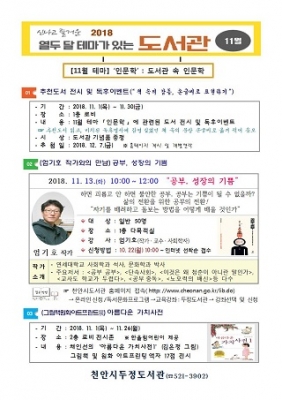 [충청뉴스큐] 천안시두정도서관은 오는 11월 ‘인문학’을 주제로 한 다채로운 프로그램 ‘도서관 속 인문학’을 운영한다고 밝혔다.