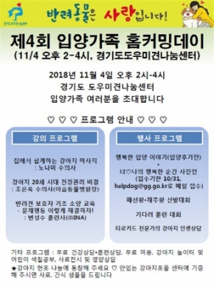경기도 도우미견나눔센터는 오는 11월 4일 오후 2시부터 센터를 통해 입양된 반려견과 보호자들을 초청해 ‘제4회 반려견 입양가족 홈커밍데이’ 행사를 개최한다고 밝혔다.
