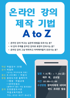 [충청뉴스큐] 인천시교육청중앙도서관은 코로나19 확산으로 비대면 교육이 일상화됨에 따라 마을 강사들의 온라인 강의 역량을 높이기 위한 강좌를 개설했다.