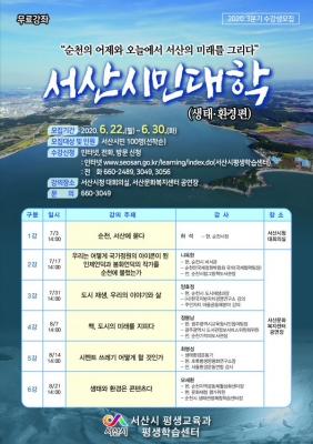 그동안 시민대학은 일반시민 50명을 공개모집해 평생학습센터 배움실에서 운영했으나, 이번 특별강좌는 대한민국 생태도시 순천만의 기적을 통해 지역생태자원의 가치를 공유하고 도시성장을 위해 필요한 지혜와 정보를 나누며‘시민의 서산’에 걸 맞는 공동체성 발현과 업무 역량강화를 위해 생태·환경 분야에 관심이 있는 공무원 50명을 추가로 공개모집해 총 100명으로 운영한다.