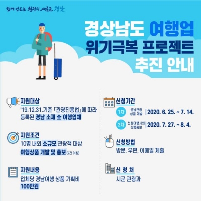 [충청뉴스큐] 경상남도는 ‘경남형 여행업 위기극복 프로젝트 사업’ 참여 신청을 25일부터 오는 7월 14일까지 20일간 접수한다고 밝혔다.