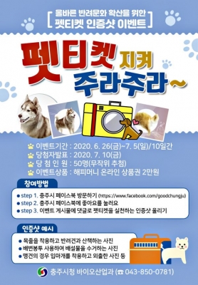 코로나19 감염을 예방하기 위해 비대면 방식인 SNS를 통해 진행되는 이번 이벤트는 반려인들의 성숙한 반려 문화의 실천을 공유해 반려인과 비반려인 간의 갈등을 해소하고 공감할 수 있는 계기를 만들고자 마련됐다참여 방법은 반려견과 산책 시 목줄 사용, 배변 봉투를 이용한 배설물 처리 등 펫티켓을 실천한 후 충주시 공식 페이스북 이벤트 게시물에 ‘펫티켓 인증샷’을 댓글로 올리면 된다.