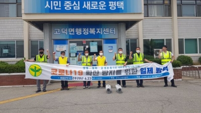 [충청뉴스큐] 평택시 고덕면 새마을지도자는 지난 23일 30도가 넘는 무더위 속에서도 코로나19 확산 방지를 위한 방역활동에 동참했다.