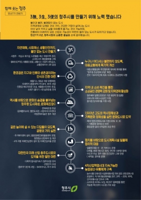한편 올해 신년사에서 밝힌 바와 같이 청주시는 불안과 불편, 불쾌함이 없는 도시, 지역경제와 오래된 것의 가치, 건강한 가정이 살아나는 도시, 아이 낳아 키우고 삶을 여유롭게 즐기는 것이 가능하며 전통부터 미래까지 모든 산업의 가능성이 무한히 열려 있는 도시인 3無, 3生, 3便의 시정을 펼치고 있다.